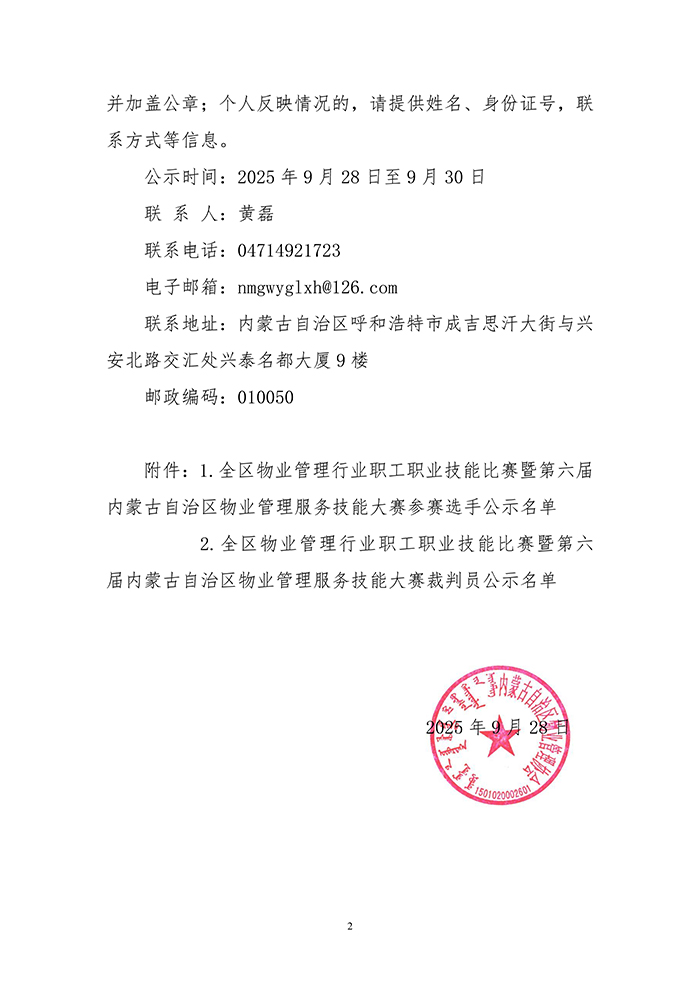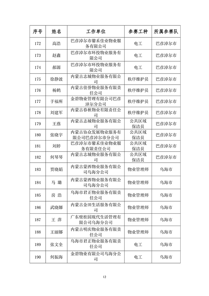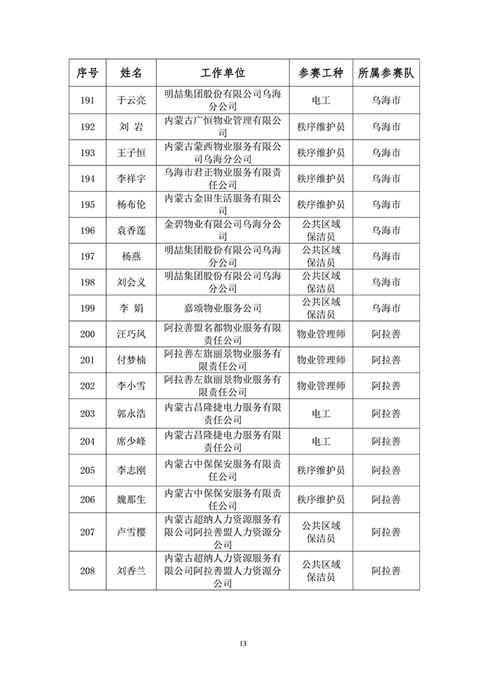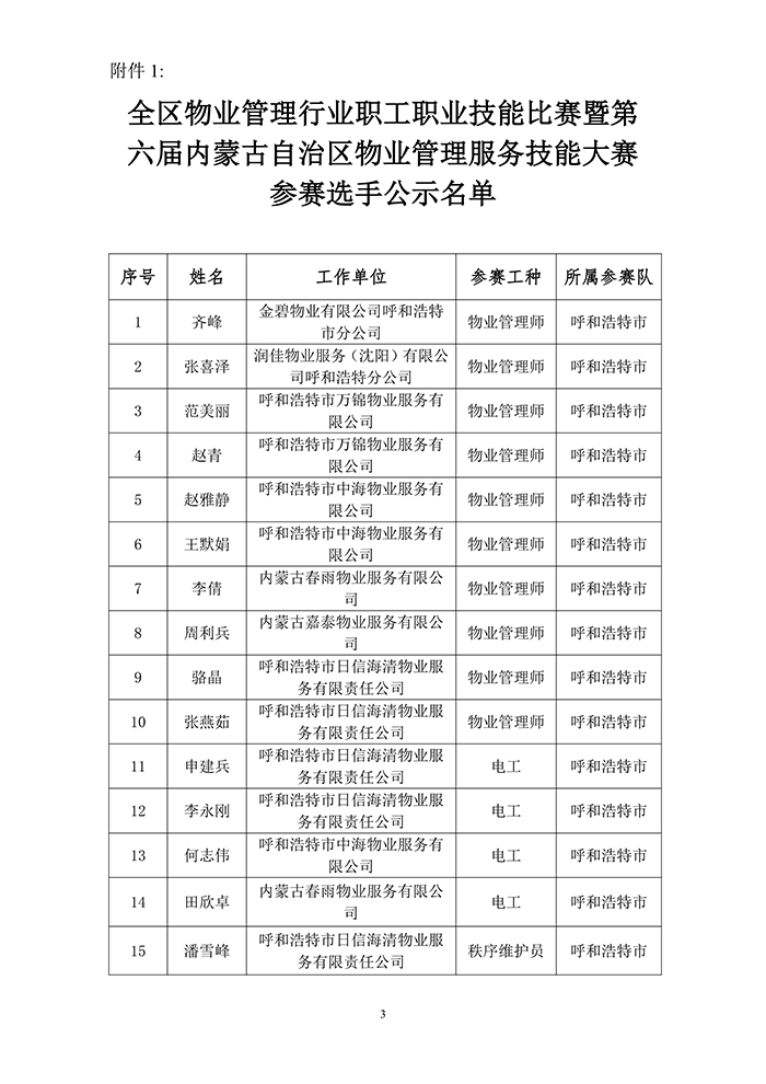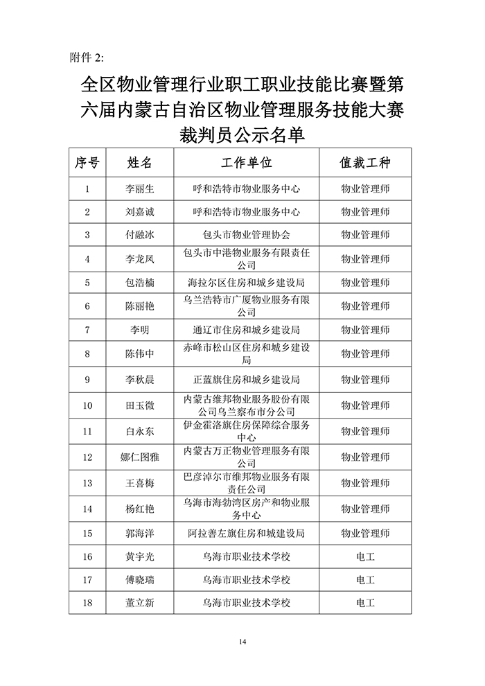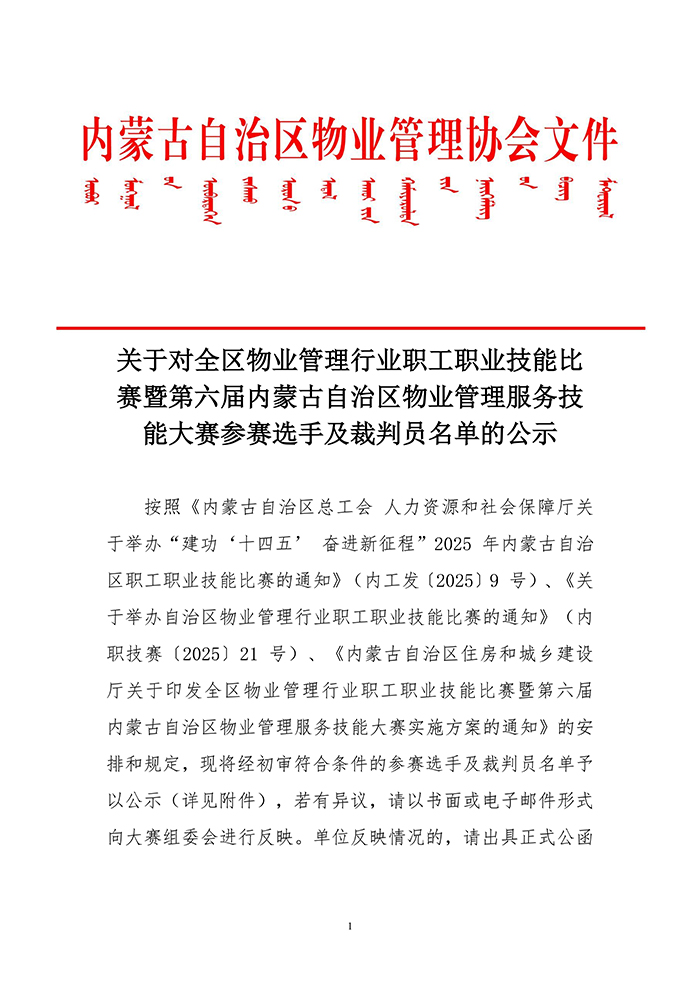关于对全区物业管理行业职工职业技能比赛暨第六届内蒙古自治区物业管理服务技能大赛参赛选手及裁判员名单的公示
